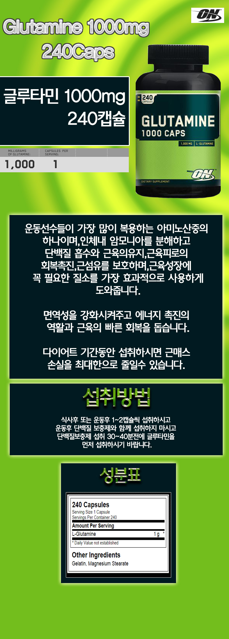 (유통기한세일)Optimum/ Glutamine 1000mg 240caps 옵티멈사의 글루타민 1000mg 240캡슐