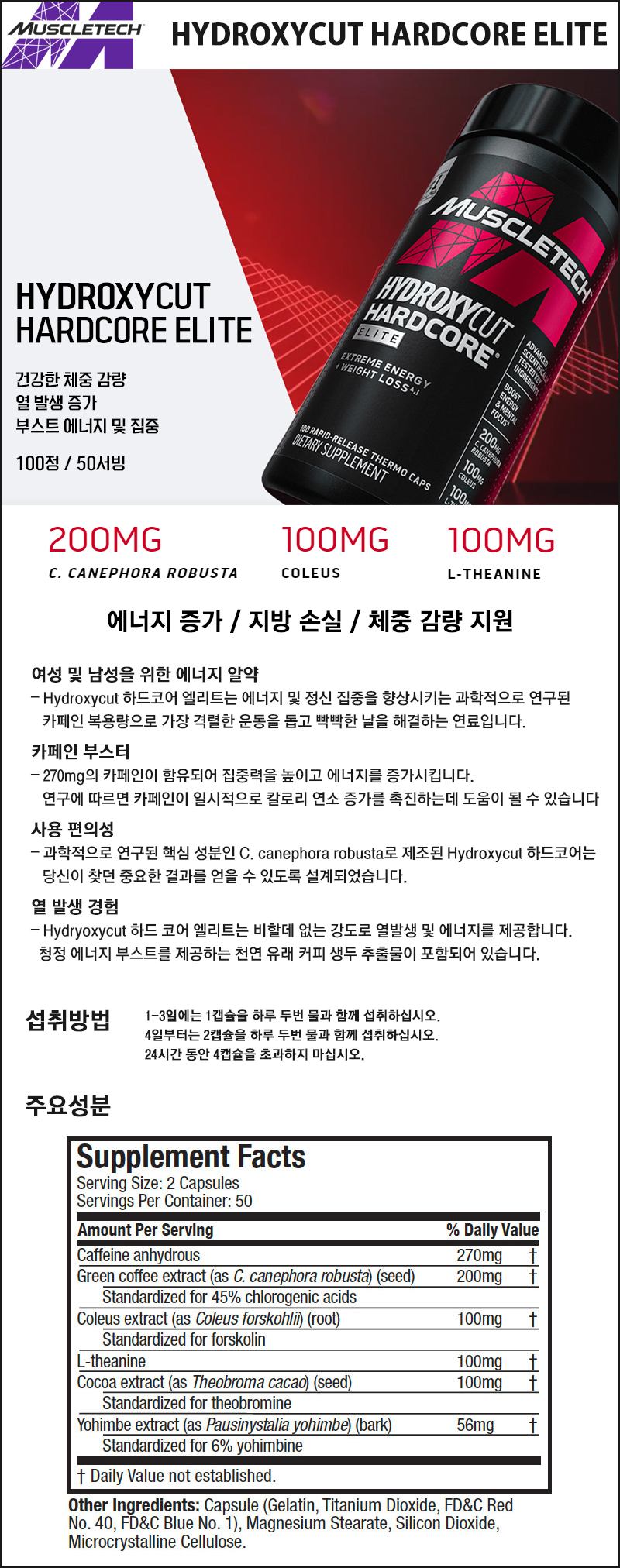 *MuscleTech/ HYDROXYCUT Hardcore ELITE 100CAPS '체지방 연소와 에너지 향상을 돕는 고자극 다이어트 캡슐''